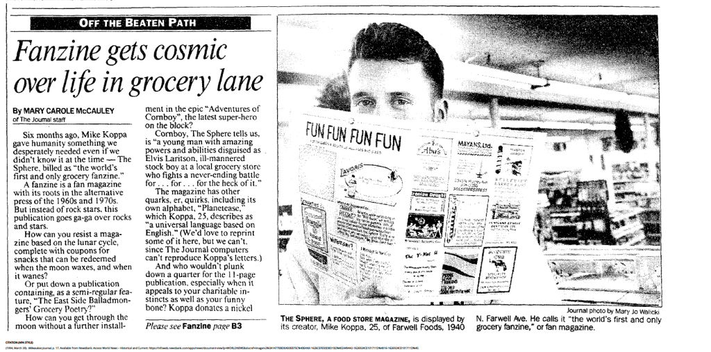 McCauley, M. (1994, March 30). Fanzine gets cosmic over life in grocery lane. Milwaukee Journal. p. 17