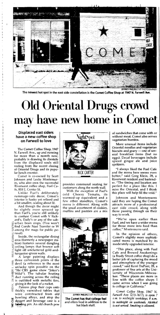 Carter, N. (1995, December 1). Old Oriental Drugs crowd may have home in Comet. Milwaukee Journal. p.52